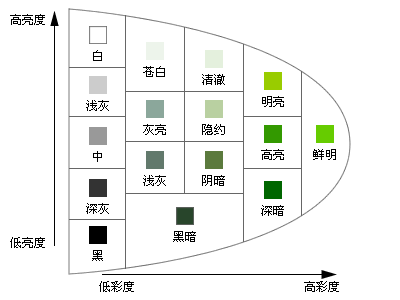 鮮明(Vivid)、高亮(Strong)、明亮(Bright)、清澈(Pale)、蒼白(Very Pale)、灰亮(Light Grayish)、隱約(Light)、淺灰(Grayish)、陰暗(Dull)、深暗(Deep)、黑暗(Dark)。
