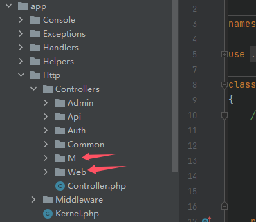 1、在app\http\Controllers文件夾里面創(chuàng)建PC端和移動端不同的控制器文件夾,分別對應(yīng)PC端的路由文件及移動端路由文件