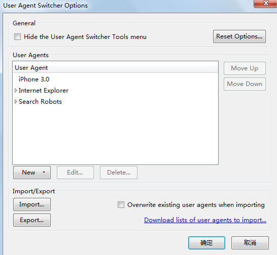 選擇“EditUser Agent”或“UserAgent Switcher”=>"Options",打開如下的設置頁面。