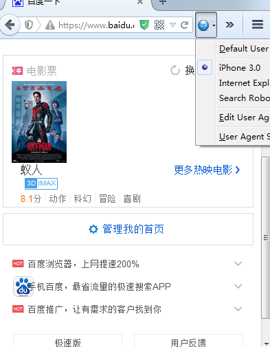 之前站長學院文章<代碼適配移動站點對百度友好案例分享>中提到過Google 瀏覽器來模擬UA效果的插件,在此我再介紹一款火狐瀏覽器的UA模擬插件,它可以幫助各位站長輕松的”偽裝”成其他平臺/品牌的瀏覽器,來測試自己網站的適配結果