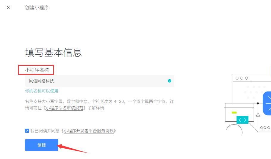 (3)輸入小程序名稱,閱讀協(xié)議后勾選已閱讀并同意,然后點擊創(chuàng)建。