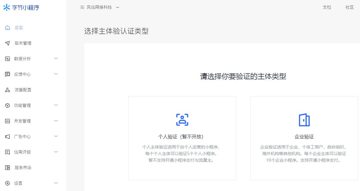 (2)支持的主體身份類型:企業(yè)開發(fā)者,個人開發(fā)者。(字節(jié)平臺調(diào)整,目前個人主體暫不開放認(rèn)證)