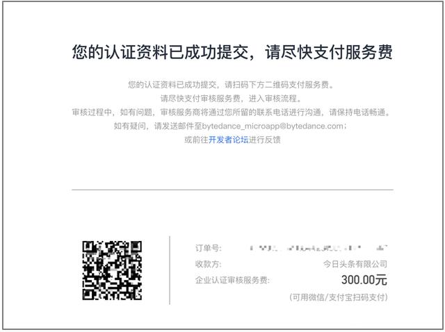 企業(yè)開發(fā)者需支付 300 元/次的審核服務(wù)費用。這是用戶基于字節(jié)跳動提供的資質(zhì)審核服務(wù)而支付的一次性費用,用戶每申請一次認(rèn)證服務(wù)需要支付一次審核服務(wù)費。無論認(rèn)證成功或失敗,都需要支付審核服務(wù)費